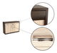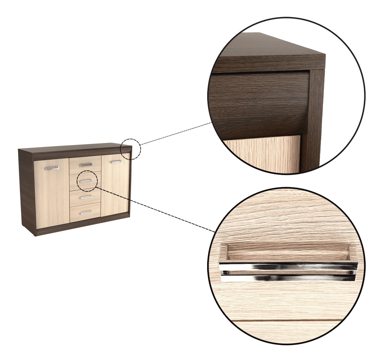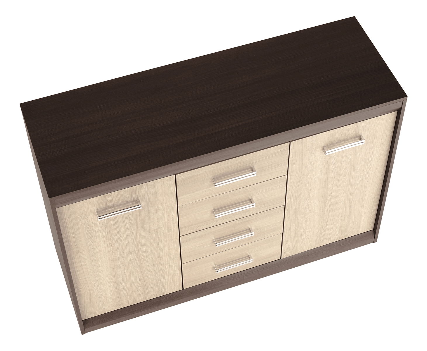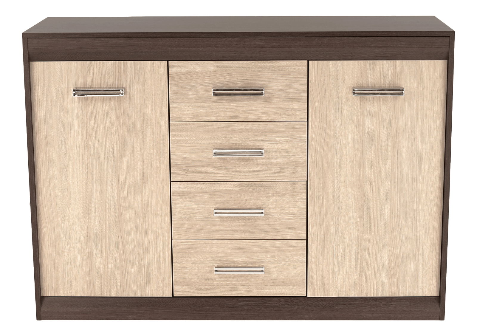 Komoda k obývacej stene Korina, ktorá Vám poskytne množstvo úložného priestoru pre oblečenie alebo rôzne doplnky. Komoda má dvoje dvierka a štyri zásuvky uprostred. Dvierka a zásuvky majú strieborné úchyty.