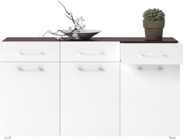 Dizajnová komoda v bielom lesku, ktorú odporúčame k obývačkovej zostave Presto s označením PR-01a alebo PR-01b. Kombinácia troch dvierok a nad nimi troch zásuviek. Vo vnútri je za každými dvierkami polica.