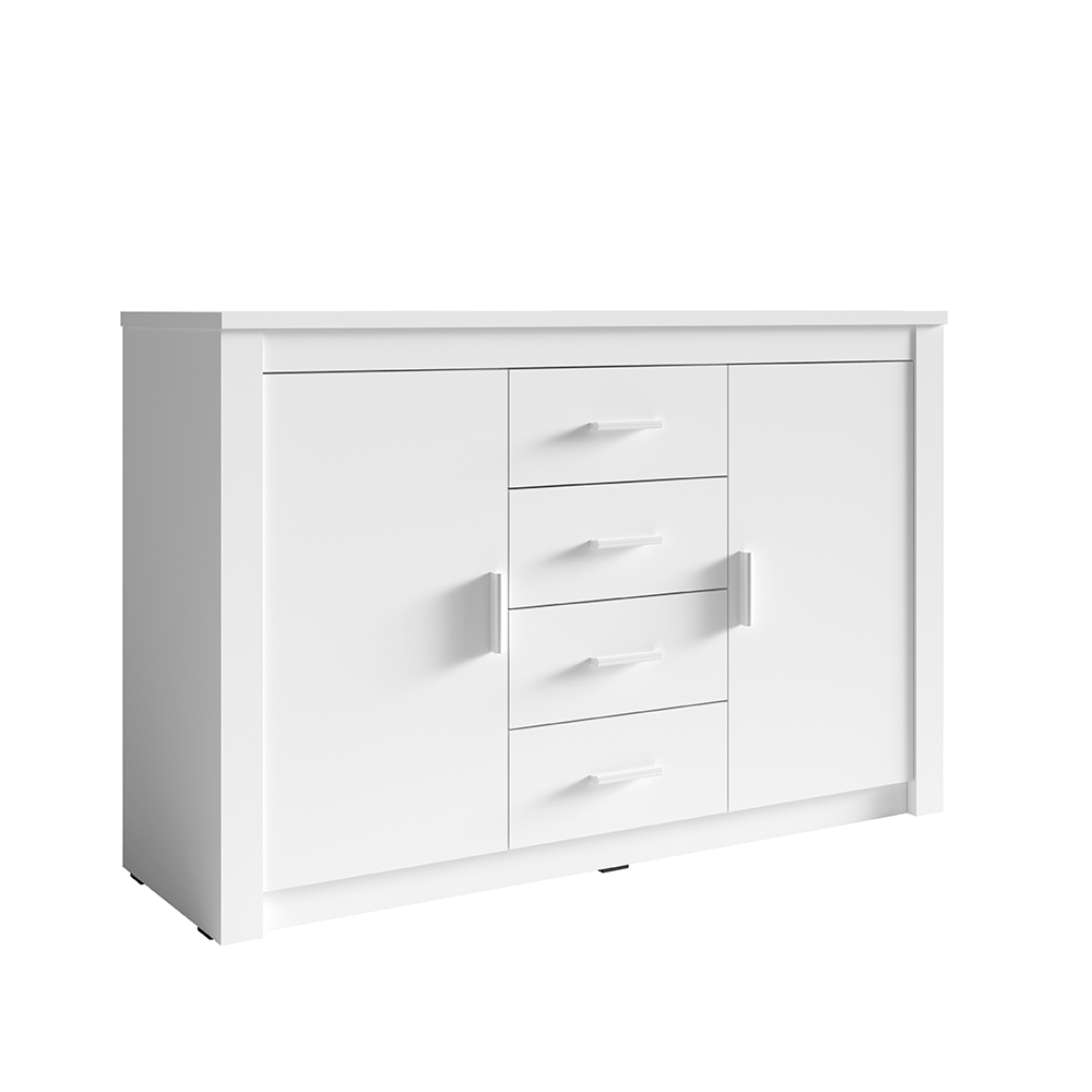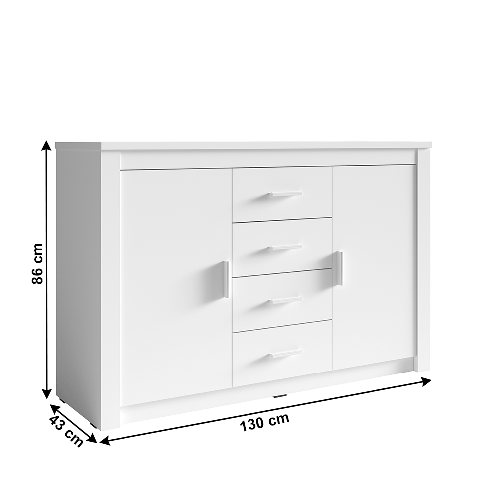 Komoda Raloma (biela) je ideálna pre tých, ktorí hľadajú praktický nábytok so štýlovým dizajnom. S výškou 86 cm a hĺbkou 43 cm je dostatočne veľká na uskladnenie vašich vecí, ale zároveň nepôsobí príliš veľkým dojmom v miestnosti. Komoda je vyrobená z laminovanej DTD, ktorá zaručuje trvanlivosť a ľahkú údržbu. Kombinovaný dizajn, ktorý zahŕňa 4 zásuvky a 2 skrinky, je skvelý pre organizáciu vašich vecí. Skrinka s policou rozdelenou na 2 časti je ideálna pre veci, ktoré chcete mať na očiach. Pre bezpečnosť odporúčame komodu pripevniť k stene. Komoda má nosnosť až 30 kg, zásuvky 8 kg a police 10 kg, takže sa nemusíte obávať, že by sa vám veci nezmestili alebo že by sa komoda neudržala. Svojou bielou farbou dokonale zapadne do akéhokoľvek interiéru.