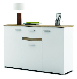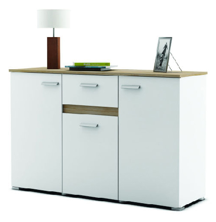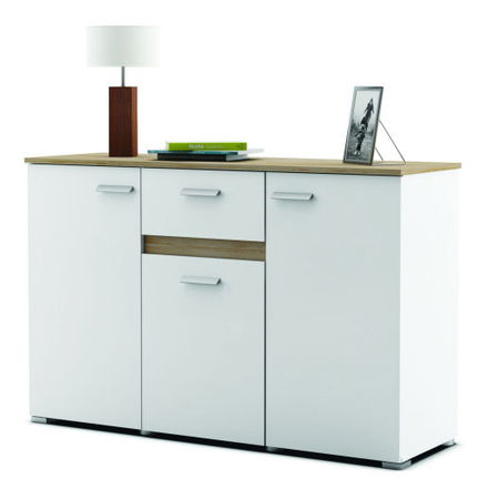 Moderná komoda, ktorá sa hodí ako do obývacej izby, tak do spálne či kancelárie. Vyrobená je z laminovanej DTD bielej farby, ktorú elegantne dopĺňajú prvky vo farbe dreva dub.
