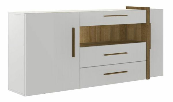 Široká komoda s tromi zásuvkami a dvomi dvierkami. Moderný dizajn je doplnený o dekoratívnu lištu v prevedení dub riviera. Biele farebné prevedenie je vhodné najmä do tmavších priestorov, ktoré presvetlí a oživí. Dvierka a zásuvky majú systém tichého dojazdu.