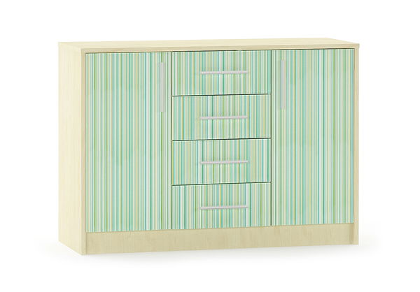 Komoda Simba je vhodná najmä do študentských a detských izieb. Na ľavej a pravej strane sa nachádzajú skrinky a uprostred štyri praktické zásuvky. Dvierka a zásuvky majú širšie kovové úchyty. Komoda je v prevedení rainbow zelená.
