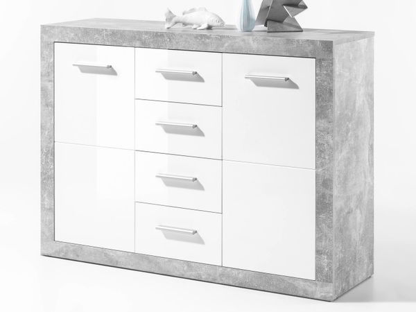 Komoda s výrazným orámovaním sivej farby a s frontami v bielom lesku. Komoda má štyri zásuvky a dvoje dvierka.