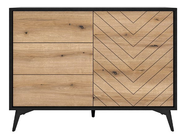 Štýlové usporiadanie podkrovia a moderných interiérov dopĺňa komoda na nožičkách . Drevený vzor v kombinácii s tmavým rámom umocňuje elegantný vzhľad nielen komody , ale celého dekoru. Zaujímavým akcentom je tu ozdobné frézovanie prednej strany. Tento malý detail je charakteristickým prvkom celej kolekcie nábytku. Praktickou výhodou komody so skrinkou a zásuvkami je úložná kapacita. Každá priehradka má priestrannú oblasť, ktorá umožňuje skryť rôzne druhy predmetov. Otváranie pomocou mechanizmu "Push to open" poskytuje jednoduchý a rýchly prístup k veciam uloženým vo vnútri.