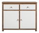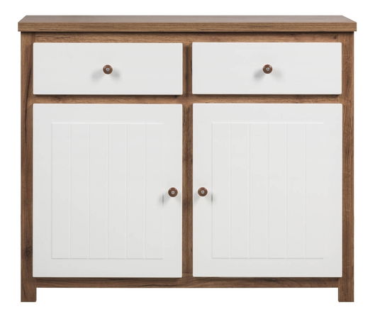 Krásna dvojdielna komoda s dvierkami a dvomi zásuvkami umiestenými pod hornou doskou. Zaujímavé drobné okrúhle úchyty na dvierkach a zásuvkách príjemne osviežia svetlé prevedenie.