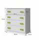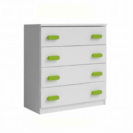 Komoda príťažlivého moderného dizajnu, ktorá osvieži detskú alebo študentskú izbu vďaka farebným úchytom. Komoda má štyri zásuvky a hrubšie úchyty. Farebné prevedenie komody je biela farba.