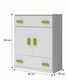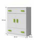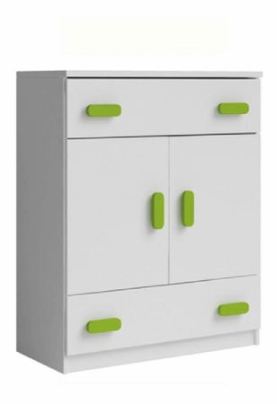 Šikovná komoda krásneho dizajnu s dvomi zásuvkami a dvomi dvierkami. Zásuvky a dvierka majú farebné úchyty. Farebné prevedenie komody je biela.