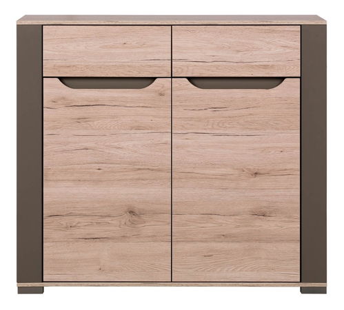 Štýlová dvojdielna komoda v prevedení dub sanremo v kombinácií s odtieňom latte dokonale doplní štýlovo zariadenú obývaciu miestnosť, jedáleň alebo inú izbu. Vybavená je dvomi zásuvkami a dvomi dvierkami. Zaujímavé vykrojené úchyty a drobné nízke nožičky.