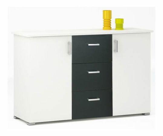 Trojdielna biela komoda vo farebnej kombinácií s čiernou. Po stranách sa nachádzajú dvierka, ktorí majú sivý úchyt na vnútornej strane pri troch zásuvkách. V strede komody sa nad sebou nachádzajú 3 zásuvky v čiernej farbe. Vo vnútri za dvierkami sa nachádzajú 2 poličky. Minimalistické sivé nožičky a úchyty.