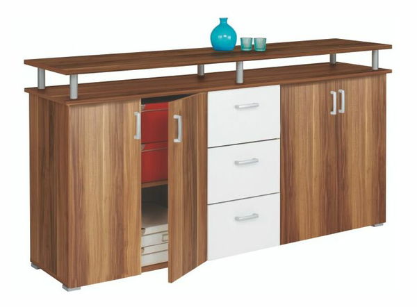 Štvordielna komoda v odtieni slivky s hornou vyvýšenou doskou na sivých nožičkách. Po stranách komody sú skrinky s dvomi dvierkami s poličkami vo vnútri. V strede komody sú umiestnené 3 zásuvky v bielom prevedení nad sebou. Minimalistické sivé nožičky a úchyty.