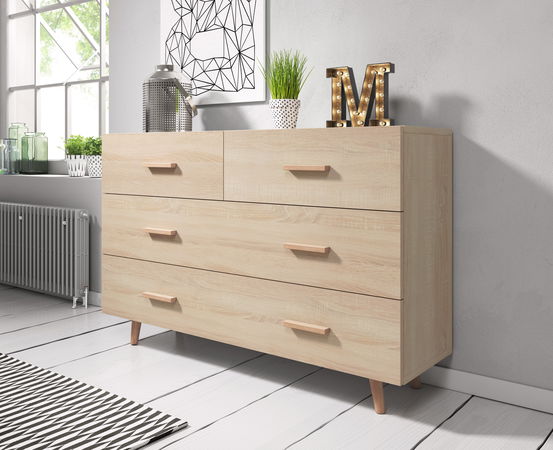 Komoda Sweden 4 vnesie do Vašej domácnosti svieži štýl a pretvorí ju v útulný a moderný priestor, v ktorom sa budete cítiť príjemne a pohodlne. Pomôže Vám nájsť miesto pre všetky drobnosti, ktoré potrebujete niekam uložiť, no neviete kam. Sweden 4 Vám poskytne až štyri zásuvky - dve menšie, nachádzajúce sa v hornej časti a dve širšie a priestrannejšie, nachádzajúce sa pod nimi.