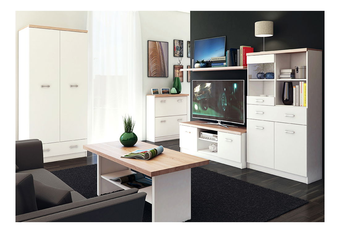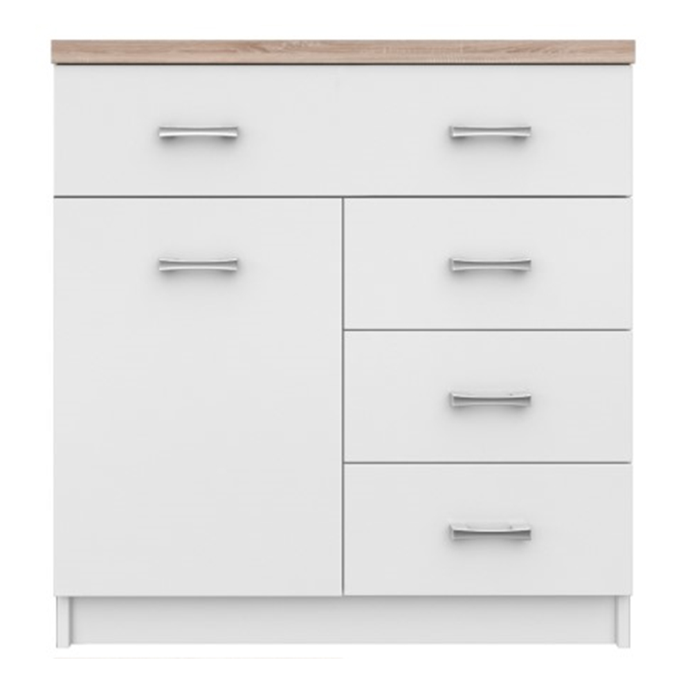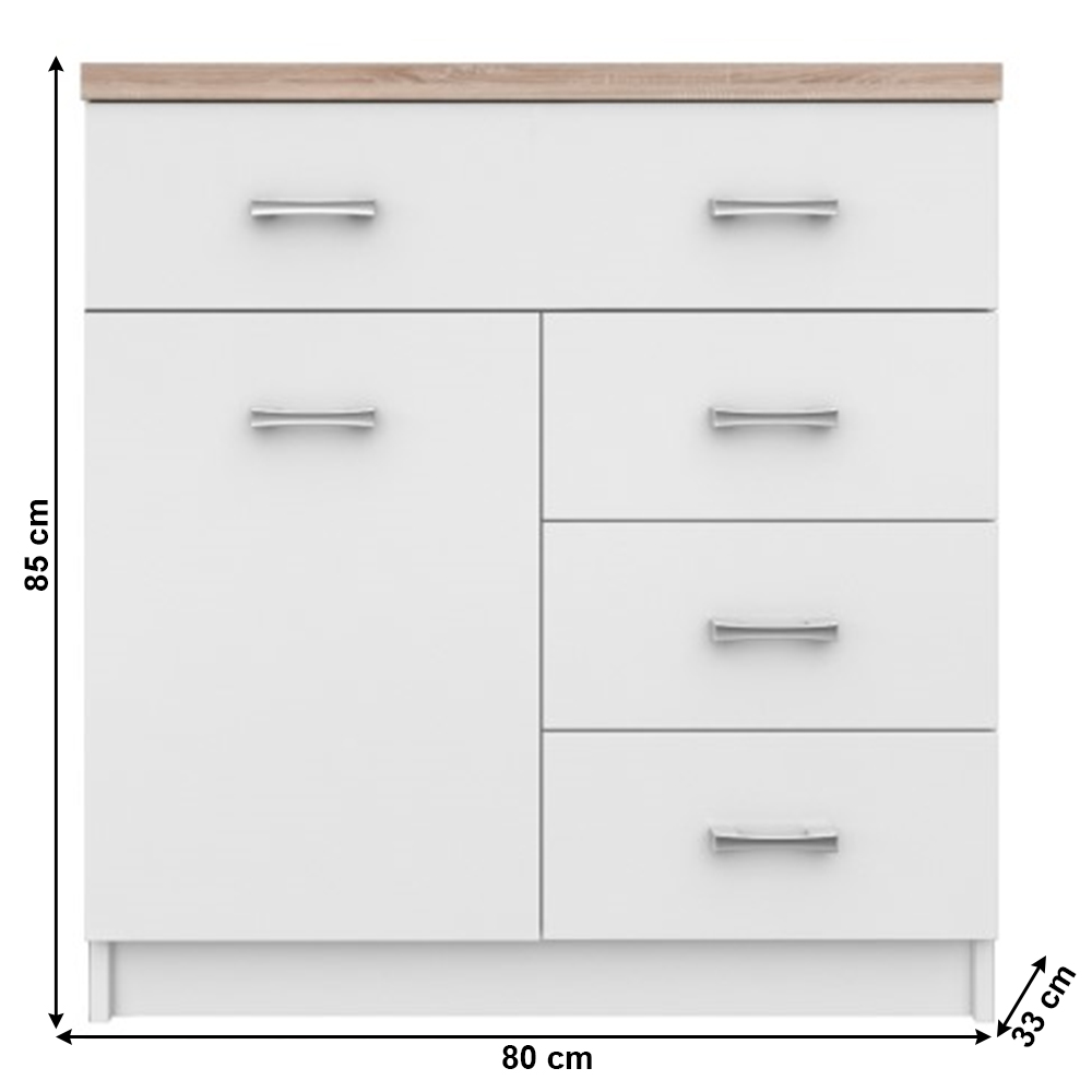 Komoda Timmy Typ 12 1D4S v bielom a dub sonoma prevedení je skvelým doplnkom do vášho interiéru. S výškou 85 cm, hĺbkou 33 cm a šírkou 80 cm poskytuje dostatok úložného priestoru. Materiál DTD laminovaná zaručuje odolnosť a pevnosť, s hrúbkou materiálu korpusu 16 mm a vrchnej dosky 32 mm. Komoda sa dodáva v demonte, ale jej zostavenie je veľmi jednoduché. Vďaka prevedeniu v bielom a dub sonoma sa hodí do rôznych štýlov a farieb miestnosti. Komoda Timmy Typ 12 1D4S je skvelou voľbou pre tých, ktorí hľadajú kvalitný a praktický nábytok.