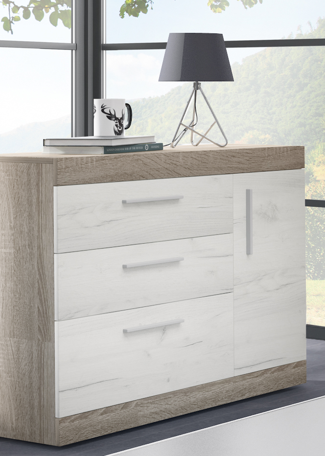 Komoda Venessa je elegantný nábytok, ktorý sa hodí do každej modernej domácnosti. S výškou 85,5 cm a hĺbkou 39 cm poskytuje dostatok úložného priestoru pre rôzne predmety vrátane oblečenia, kníh alebo dekoratívnych predmetov. Komoda je vyrobená z kvalitného dreva Dub sonoma truflový a Dub biely, ktoré dodávajú kusom nábytku elegantný a príjemný vzhľad. Vďaka jednoduchému a modernému dizajnu sa dokonale hodí do každej miestnosti vašej domácnosti a pritom dodáva praktické riešenie na ukladanie vecí. S touto komodou si môžete byť istí, že vaše veci budú vždy na svojom mieste a zároveň pridáte svojmu interiéru štýlový prírastok.