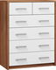 Praktická komoda je určená na kombinovanie so spálňovým nábytkom Vera, ale môžete ju použiť aj ako samostatný nábytok do ostatných miestností v byte. Obsahuje štyri veľké a dve malé zásuvky, čím poskytuje dostatok úložného priestoru. Je možné si ju objednať v štyroch farebných kombináciách. Korpus vo farbe dreva slivka spojený s bielymi zásuvkami, alebo wenge s krémovou farbou, dub sonoma s bielym leskom a slivka s čiernym leskom.