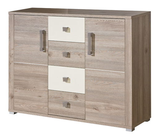 Komoda Veris so 4 zásuvkami a dvoma skrinkami nájde svoje využitie v obývačke aj v spálni alebo šatníku. Svetlá farba oživí a presvetlí každú miestnosť. Bočné skrinky sú vo vnútri rozdelené poličkou. Komoda je vyrobená z laminátových dosiek.