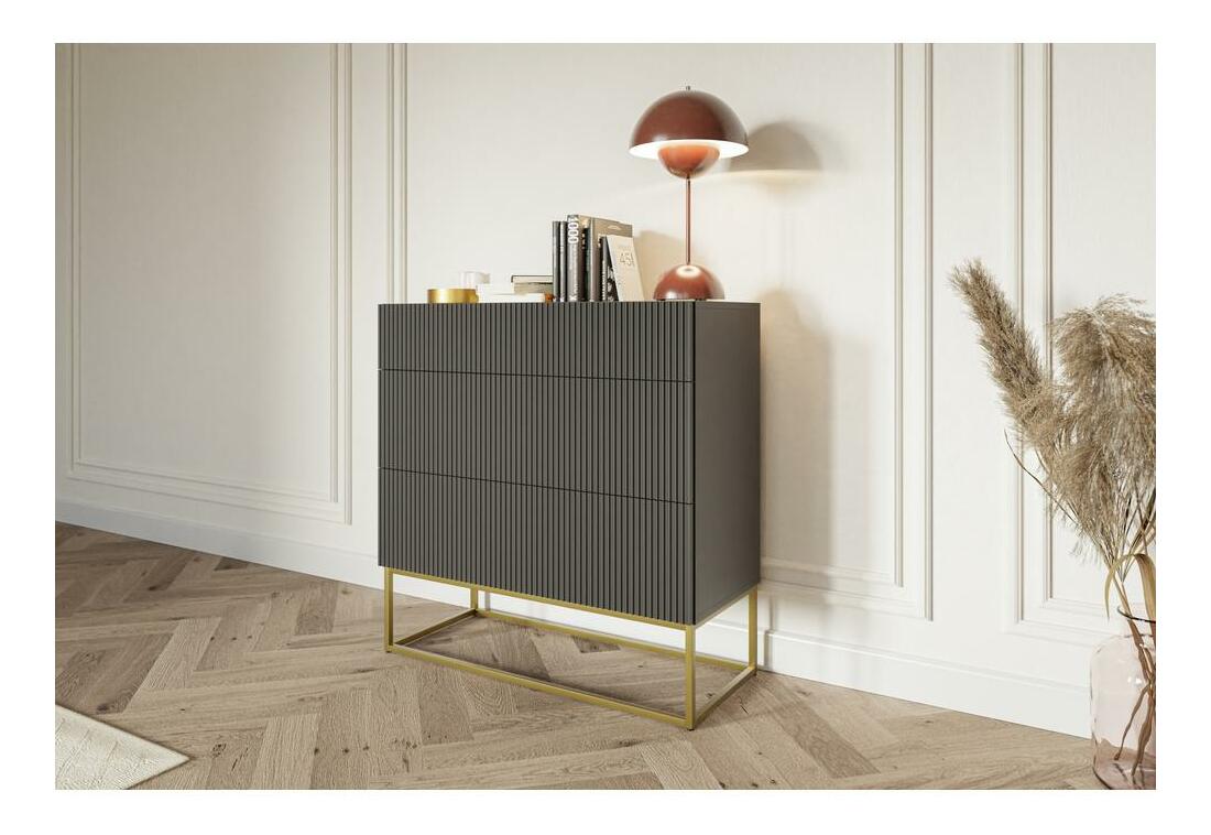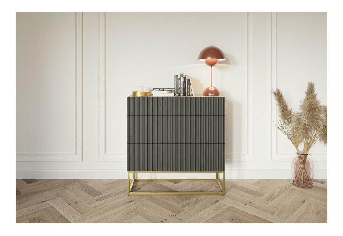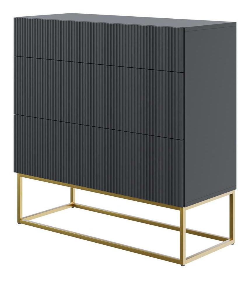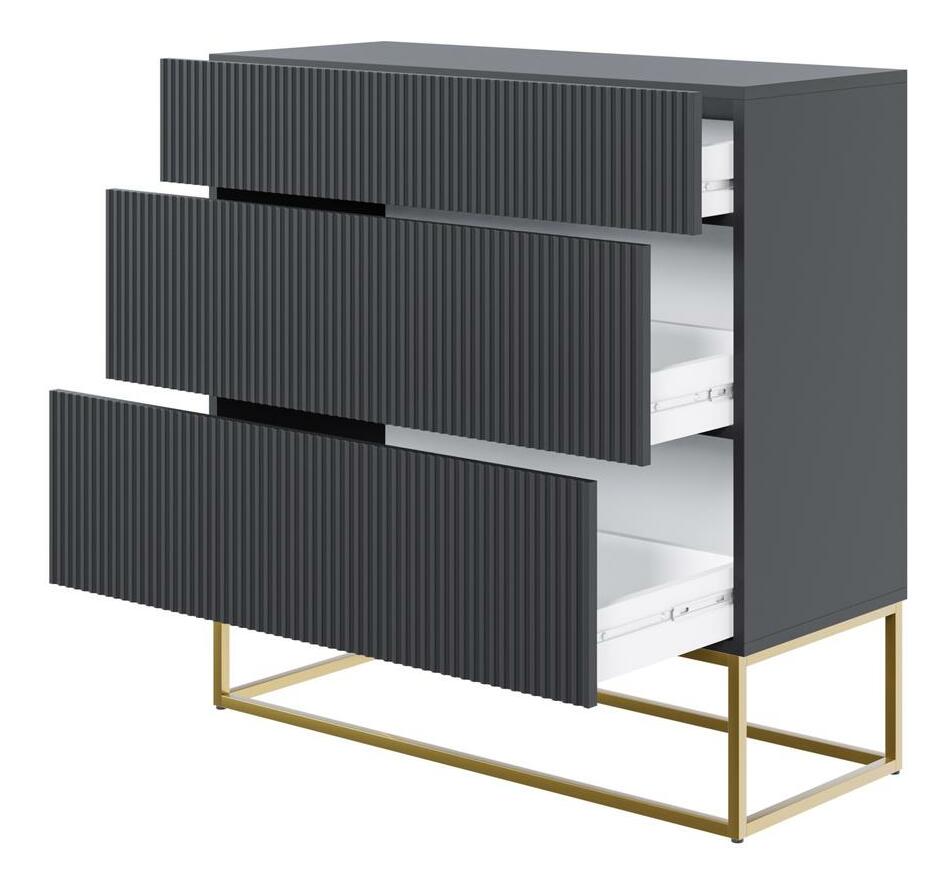 ZobraziťZariaďujete si svoj vysnívaný byt a na dokončenie diela potrebujete ešte štýlový nábytok? V takejto situácii Vám predstavíme našu jedinečnú kolekciu - nábytok, ktorý ľahostajne neprejdete Komoda so zásuvkami je spojením minimalizmu s dizajnérskym akcentom v podobe módnych lamiel celá vec jedinečný charakter - v kombinácii s veľkým, S farebnými rastlinami bude nábytok vyzerať naozaj skvele. Nábytok má tri priestranné zásuvky, ktoré budú skvelým miestom pre kancelárske potreby, dokumenty alebo náhradné uteráky. Ak si chcete izbu personalizovať, dôležité rodinné suveníry či fotografie si nepochybne nájdu svoje miesto na širokej doske skrinky. Ďalšou výhodou nábytku sú pevné nohy v podobe rámu z prášk lakovanej ocele, ktoré mu poskytujú maximálnu stabilitu a zároveň sú štýlovým doplnkom do obývačky Detail produktu: korpus skrine je vyrobený z 16 mm laminovaná doska Kronospan 190 PE, ktorá je odolná voči vlhkosti a poškriabaniu, čo zaisťuje dlhé používanie, lišty na prednej strane sú vyrobené z MDF, zásuvky sa otvárajú metódou push to open, nohy z ocele s práškovým nástrekom, s klzákmi. aby nedošlo k poškriabaniu podlahy.