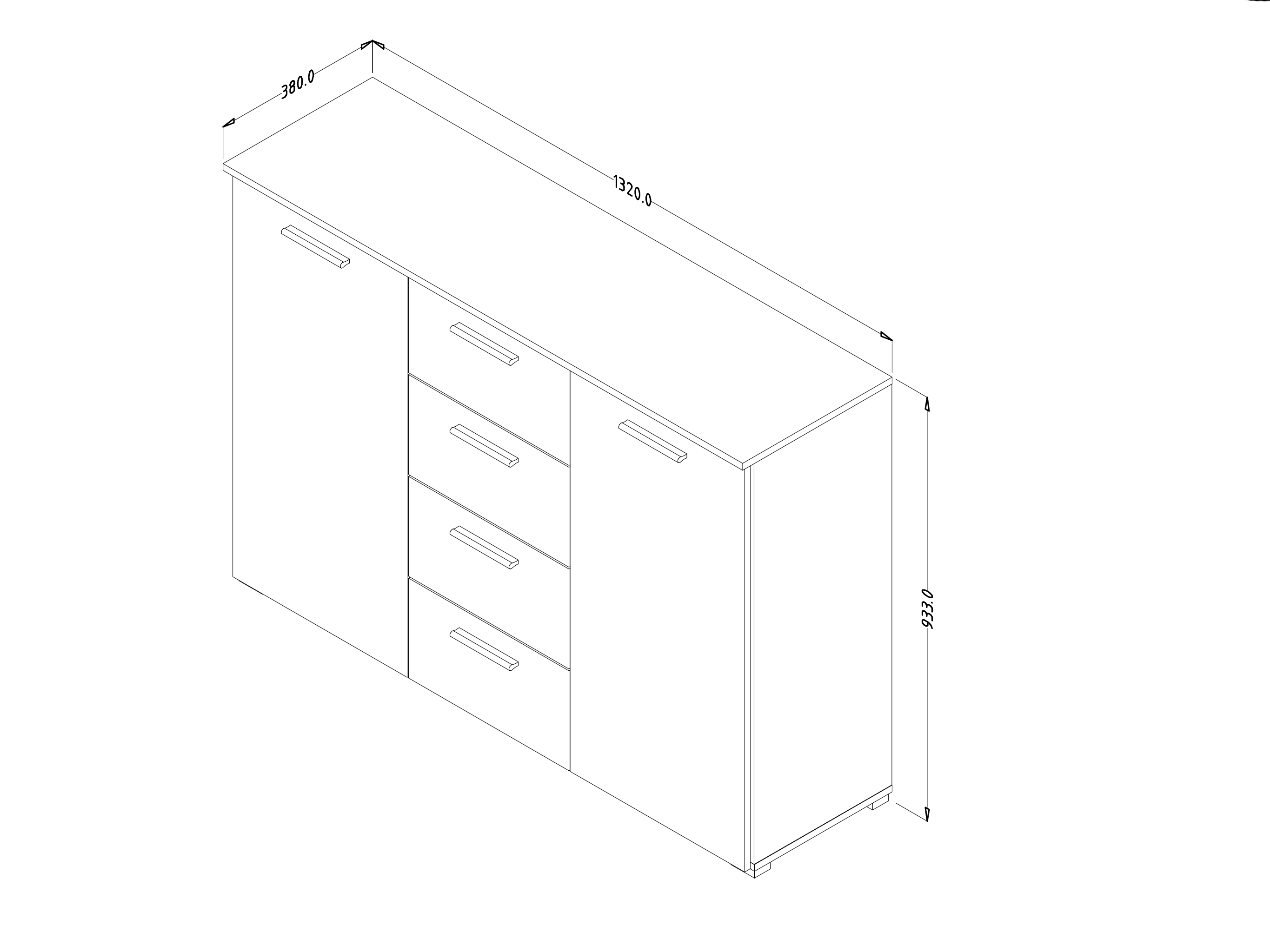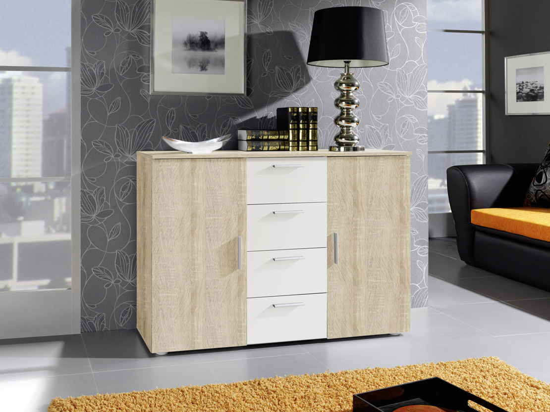 Trojdielna komoda v modernom dizajne Vám umožní usporiadať si oblečenie tak, aby ste v ňom mali prehľad. Komoda obsahuje dve skrinky po stranách a štyri zásuvky v strede. V skrinkách sa nachádza polička, ktorá ponúka dostatok úložného priestoru. Na vrch komody si môžete umiestniť dekoratívne predmety, lampičku alebo vázu s kvetinami.