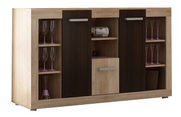 Moderná komoda je vyrábaná až v ôsmich farebných prevedeniach, čím sa skvele hodí k ostatnému nábytku vo Vašej obývacej izbe alebo jedálni. Okrem otvorených odkladacích priestorov s poličkami obsahuje aj časti uzavreté dvierkami a jednu zásuvku. Je doplnkom k obývacej stene modelovej rady Viki. Ak potrebujete viacej úložného priestoru, je možné si priobjednať aj šatníkovú skriňu v rovnakej farebnej kombinácii.