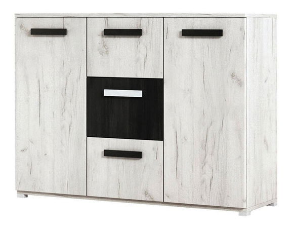 Komoda Viviama s výškou 95 cm a hĺbkou 45 cm je ideálnym doplnkom pre každú domácnosť. Je vyrobená z kvalitnej drevotriesky o hrúbke 16 mm a má ABS hrany hrúbky 0,5 mm. Vonkajší materiál je zdobený bielym Dub craft a vnútorný materiál čiernou Borovicou. Úchyty na komode sú tiež z dreva, čo dodáva celkovému dizajnu elegantný vzhľad. Komoda má plastové nožičky, ktoré zabezpečujú jej stabilitu a ochranu podlahy. Vďaka dostatku úložného priestoru v komode Viviama budú vaše veci usporiadané a ľahko dostupné. Táto komoda je dokonalým spojením funkčnosti a estetiky pre každý interiér.