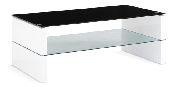 Dizajnový kus nábytku. Kombinácia čiernej a bielej je dnes v móde a tak sa tento model konferenčného stolíka hodí skoro do každého typu interiéru. Nohy sú vo vysokom lesku bielom, odkladacia doska je číre sklo, horná doska je tvrdené čierne sklo.