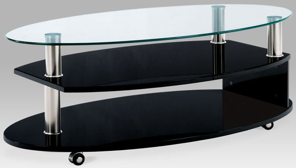 Dizajnový oválny stolík vyrobený z MDF vo vysokom lesku čiernom. Horná doska je tvrdené číre sklo, 3 kovové nožičky sú nerezové. Stolík stojí 4 kolieskach.