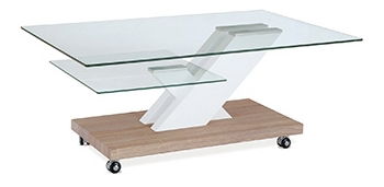Zaujímavý a praktická konferenčný stolík s 8 mm hrubou hornou doskou z číreho skla a 6 mm hrubou sklenou poličkou na odkladacie. Základňa je hrubá 50 mm a je v prevedení dub sonoma. Stolík je pojazdný na 4 kolieskach. Šikmá noha je z MDF v prevedení biely lesk.