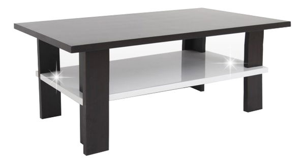 Konferenčný stolík v odtieni wenge s poličkou v strede v bielej lesklej farbe.