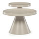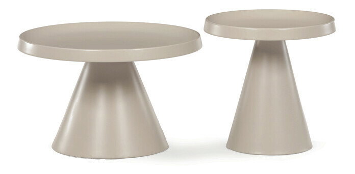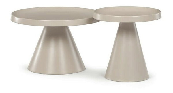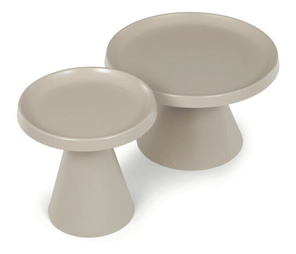 Sada dvoch konferenčných stolov v béžovom matnom prevedení ponúka kombináciu funkčnosti a moderného dizajnu. Obidve dosky aj nohy sú vyrobené z kovu, čo zabezpečuje stabilitu a dlhú životnosť, pričom povrchová úprava uľahčuje údržbu. Väčší stôl má priemer 68,5 cm a výšku 43,5 cm, menší potom priemer 49 cm a výšku 49,5 cm, čo umožňuje variabilné usporiadanie v priestore. Dekoratívne hrany dosiek podčiarkujú jednoduchý a čistý vzhľad vhodný do moderných interiérov. Pevná kovová podnož zaručuje stabilitu pri bežnom používaní.