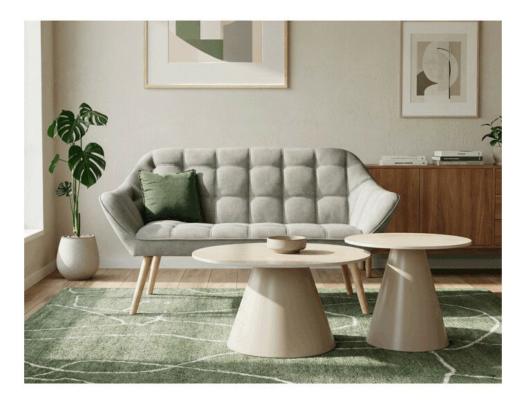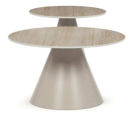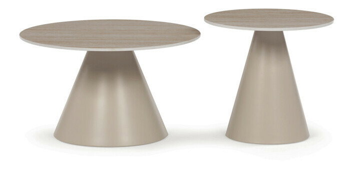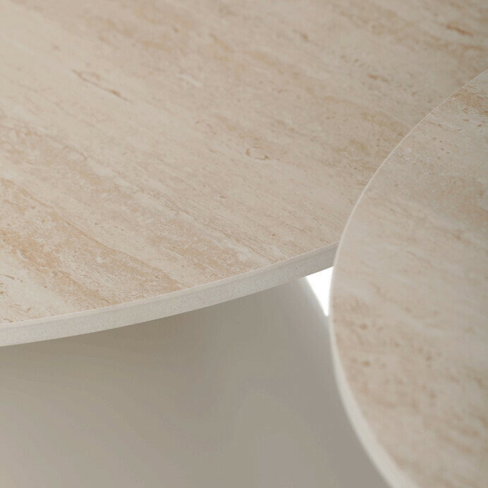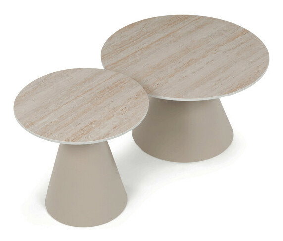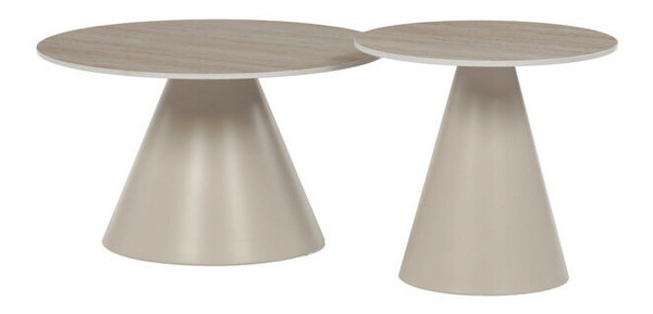 Sada konferenčných stolov v modernom štýle kombinuje keramické dosky s dekorom travertínu a stabilné kovové podnože v béžovom matnom prevedení. Väčší stôl má priemer 70 cm a výšku 40,5 cm, menší potom priemer 50 cm a výšku 47 cm, čo umožňuje variabilné usporiadanie v priestore. Keramická doska je navrhnutá pre jednoduchú údržbu a odolnosť voči bežnému opotrebovaniu, zatiaľ čo pevná kovová podnož zaisťuje stabilitu a dlhú životnosť. Dizajn stolov je minimalistický s jemnými prírodnými odtieňmi, ktoré prispievajú k príjemnej atmosfére v obývačke alebo kancelárii. Sada je ideálnou voľbou pre tých, ktorí hľadajú kombináciu funkčnosti a decentného dizajnu.