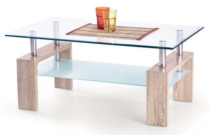 Dizajnový konferenčný stolík z kvalitnej MDF vo farbe dreva dub sonoma, ktorá je potiahnutá fóliou. Horná odkladacia plocha je zo skla a spodná polička z mliečneho skla.