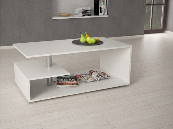 Konferenčný stolík pekného moderného dizajnu, ktorý bude najmä praktickým doplnkom vo Vašich interiéroch. Má dve odkladacie poličky, pri čom jedna je menšia a je spojená s vrchnou a spodnou doskou kovovou tyčou. Stolík je vo farebnom prevedení biela.