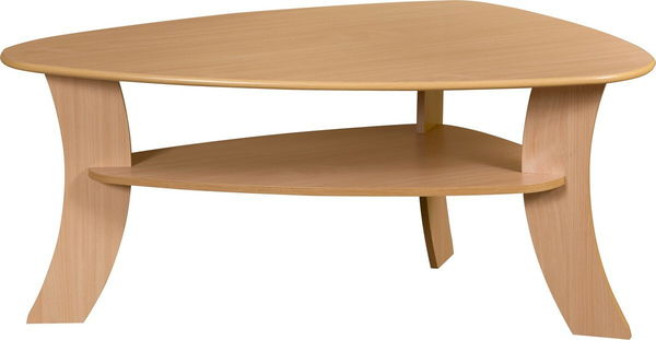 Konferenčný stolík s trojuholníkovým tvarom hornej dosky vybavený spodnou doskou ako úložným priestorom vyrábaný v prevedení buk alebo jelša. Zaujímavo zaoblené nosne nohy stolíka.