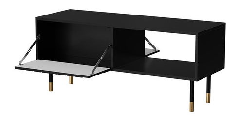 ZobraziťKonferenčný stolík je ideálnou voľbou pre tých, ktorí hľadajú pohodlie a štýl. Rozmery: šírka: 110 cm, výška: 46 cm, hĺbka: 60 cm Prevedenie: korpus: laminovaná doska hrúbky 16 mm, čelá: matná čierna MDF doska, hrúbka 16 mm + zlaté frézované lakované prvky, hrana: ABS, pánty FI35, nohy: kovové, čierno-zlaté, výška 18 cm, žiadne rukoväte, držiaky nábytku (poklopy sa otvárajú nadol), Systém otvárania "PUSH TO OPEN". Záruka: 24 mesiacov