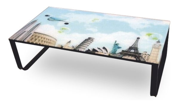 Štýlový a jedinečný kovový konferenčný stolík vyrobený z ocele v čiernom prevedení. Horná doska je sklo hrubé 0,6 mm a nachádza sa na nej zaujímavý motív.