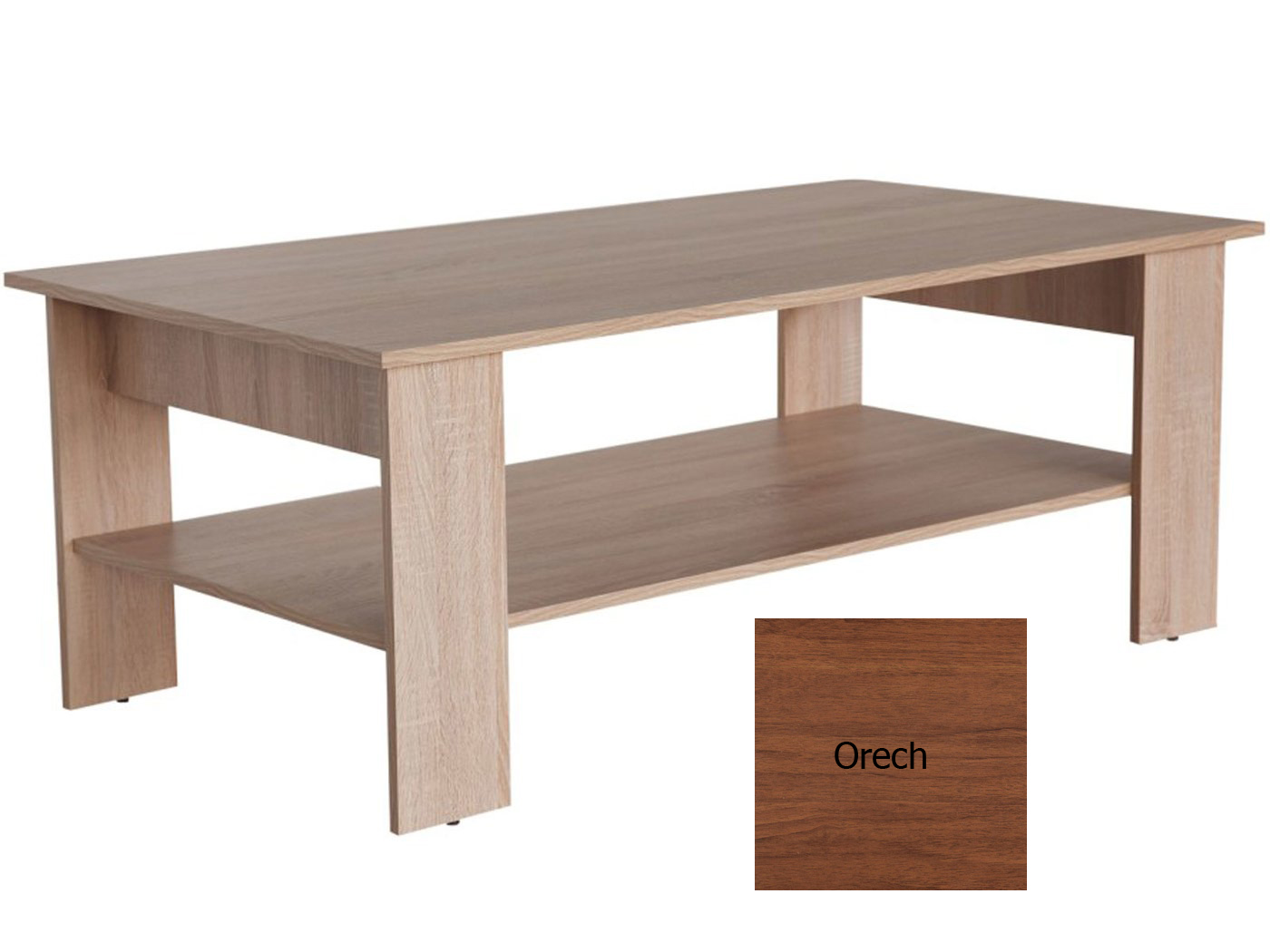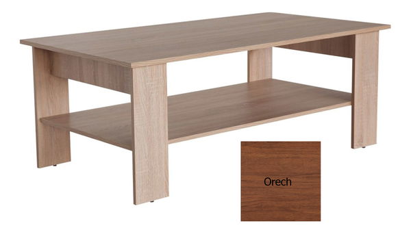 Konferenčný stolík so šírkou až 130 cm je vhodný do obývacích izieb, alebo kancelárii. Stolík má pod hornou doskou praktickú odkladaciu poličku. Kvalitu spracovania potvrdzuje použitie odolných ABS hrán na všetkých miestach rezu dosky. Farebné prevedenie orech.