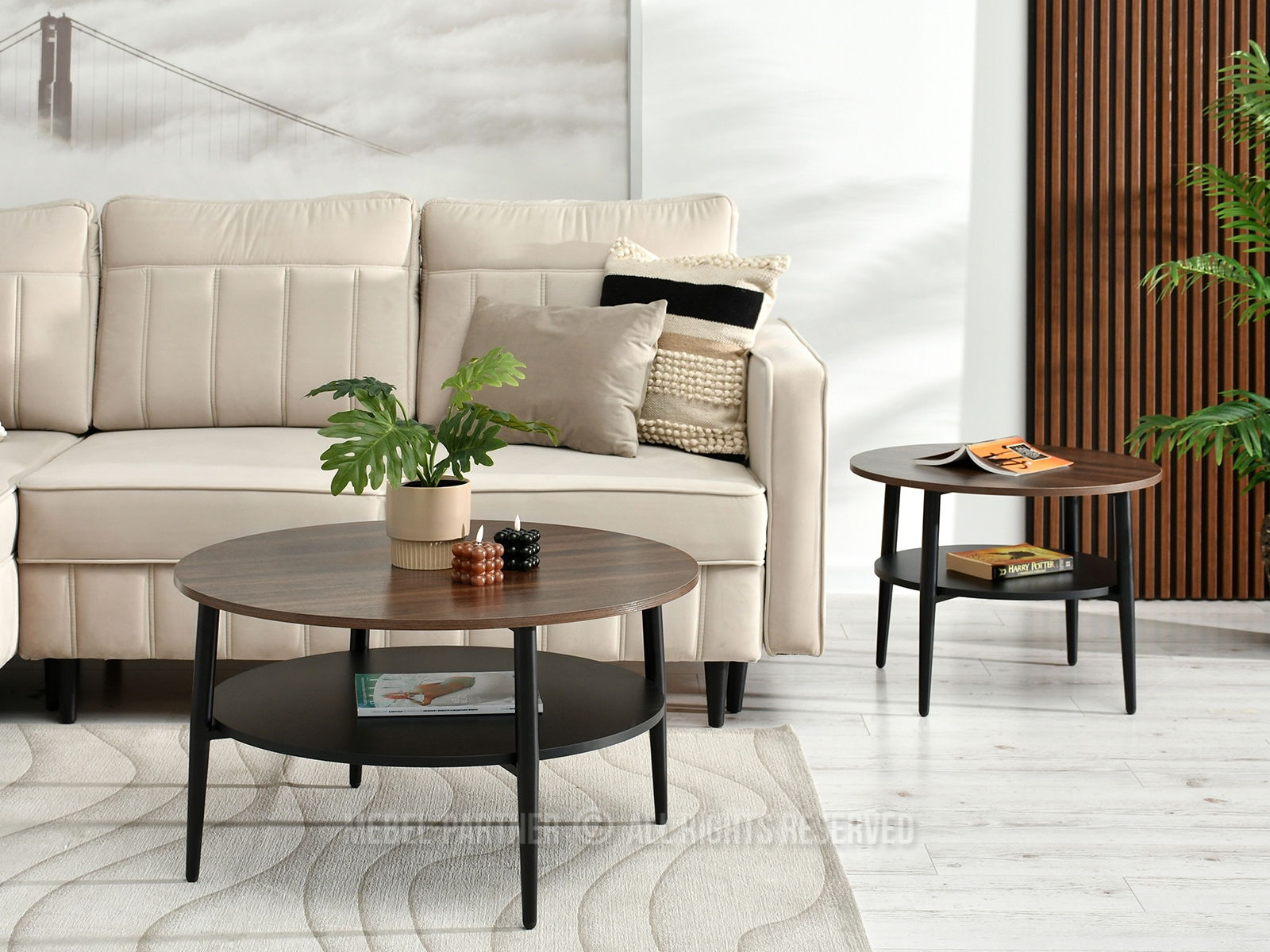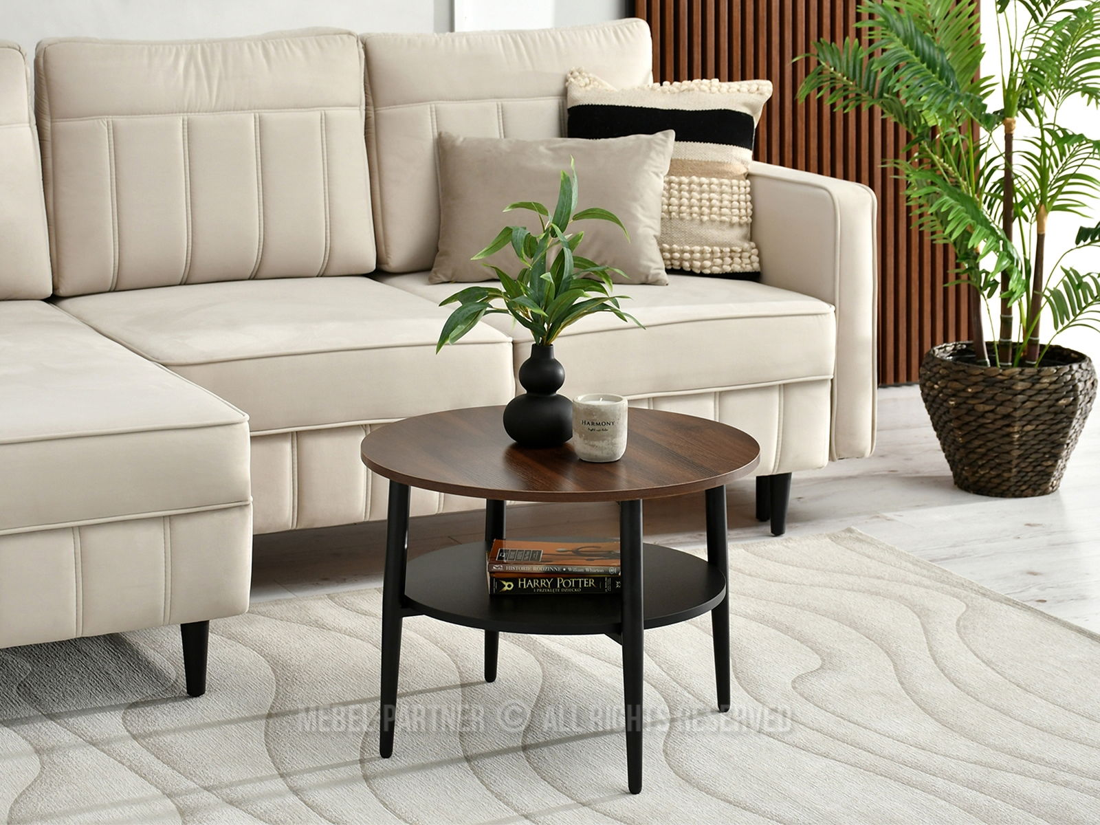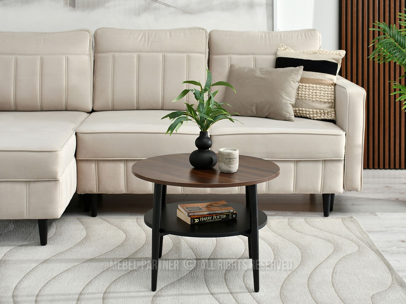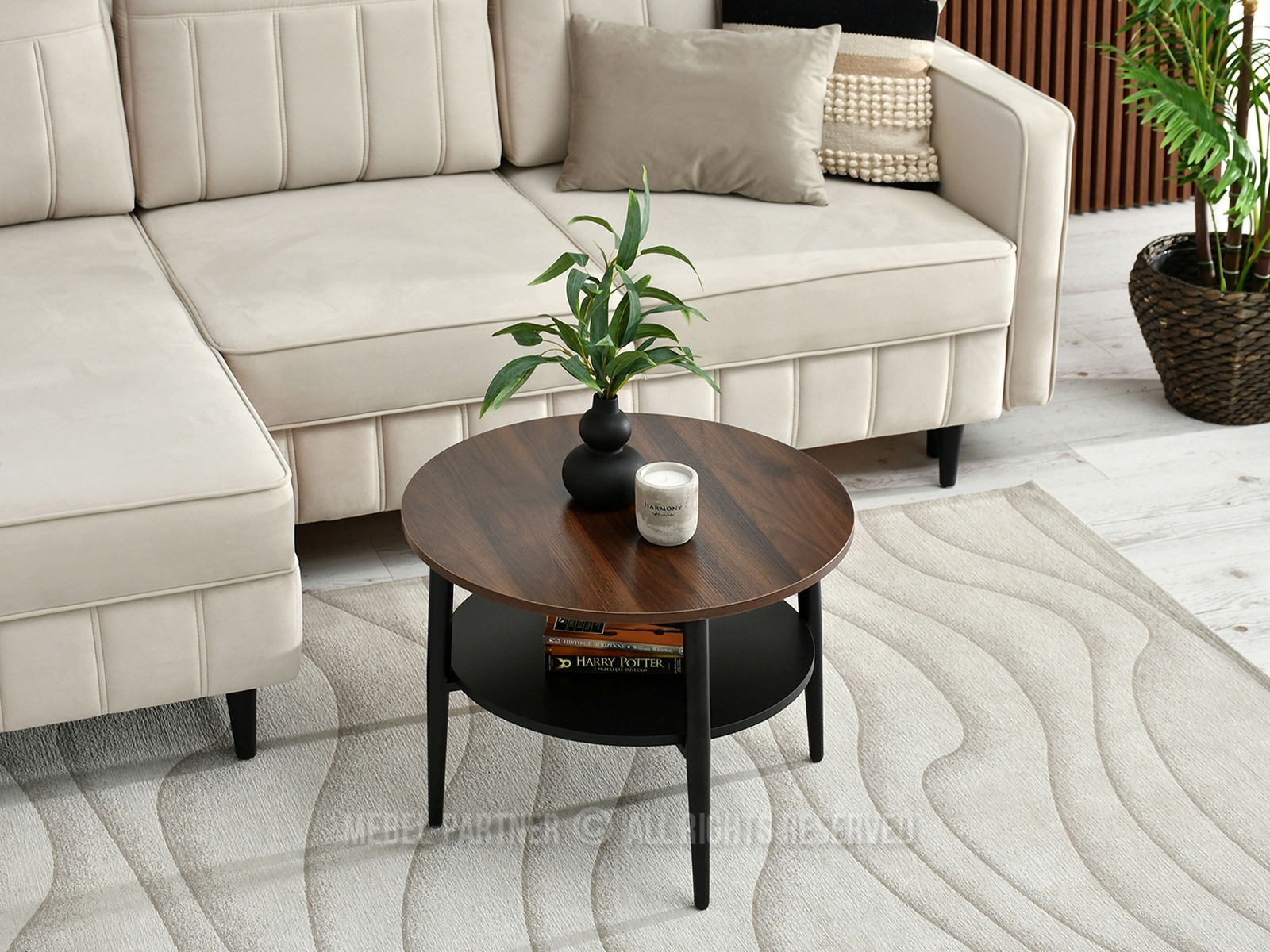 Konferenčný stolík Randolf S prináša do vášho interiéru sofistikovanú jednoduchosť a praktickosť v jednom. Jeho okrúhla doska z kvalitného orechového laminátu poskytuje dostatok priestoru na odkladanie drobností alebo dekorácií, pričom spodná polica navyše rozširuje úložný priestor pre knihy alebo časopisy.