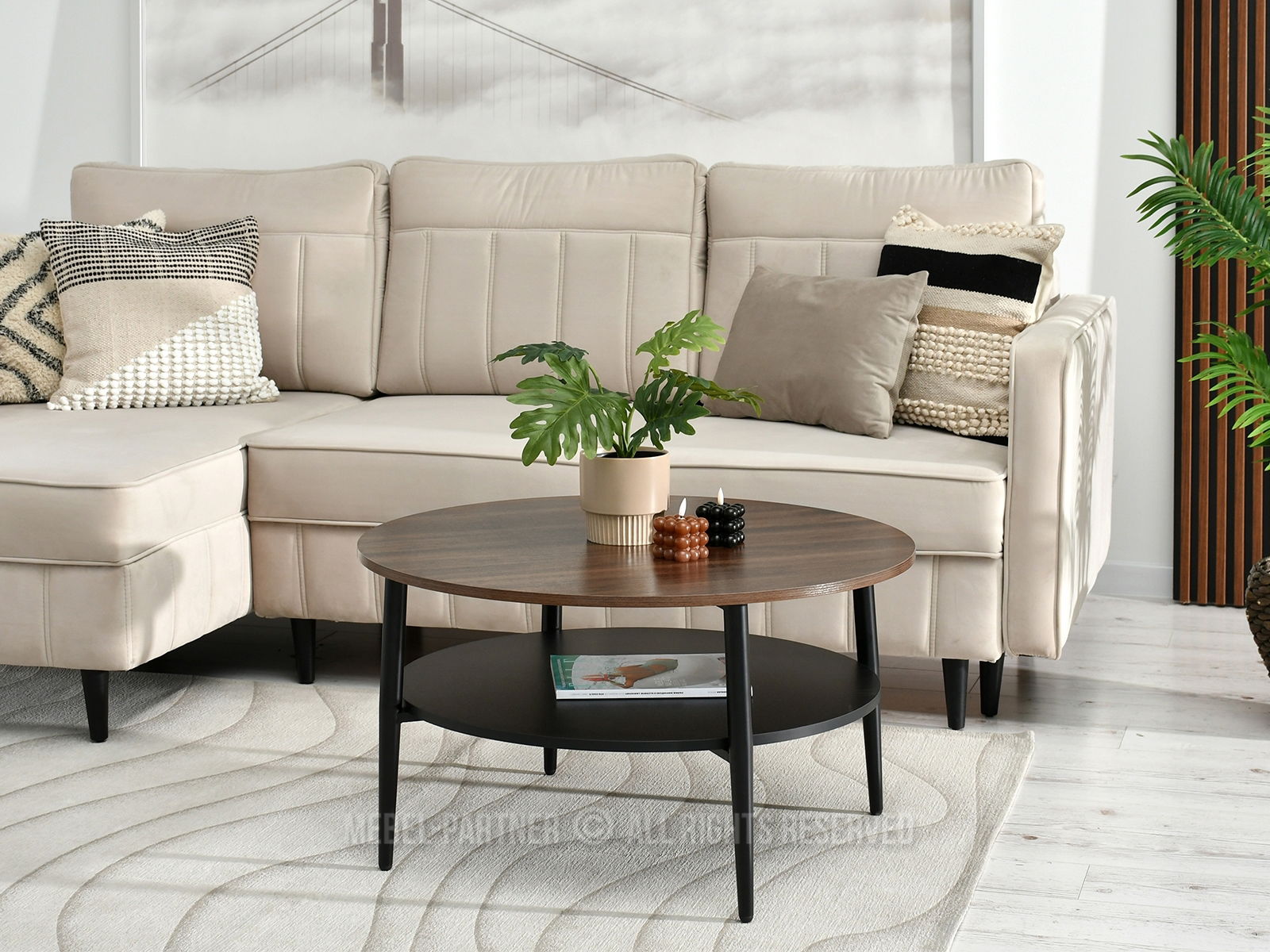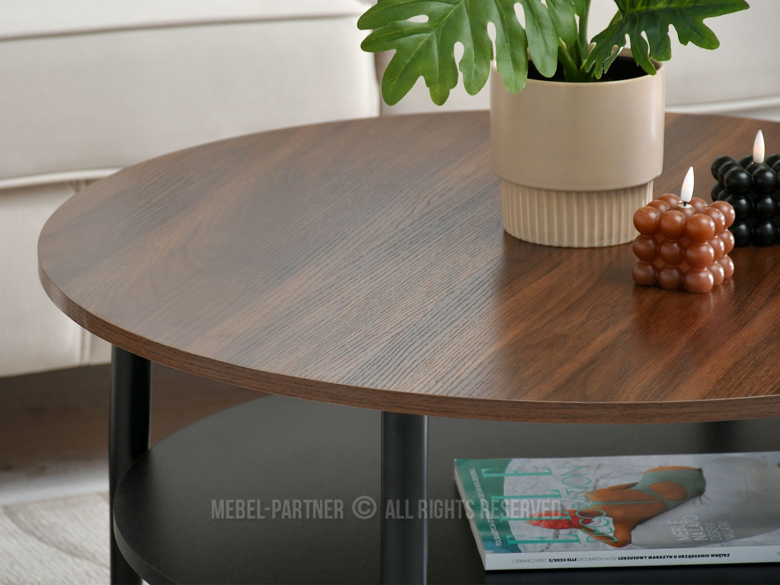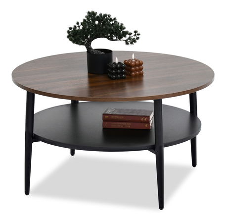 Konferenčný stolík Randolf XL v kombinácii orechového dreva a čiernych prvkov prináša do vášho obývacieho priestoru moderný a praktický kúsok nábytku. Jeho veľká okrúhla doska ponúka dostatok miesta na servírovanie kávy či vystavenie dekorácií, zatiaľ čo spodná polica zabezpečuje praktický úložný priestor pre knihy, časopisy alebo doplnky.