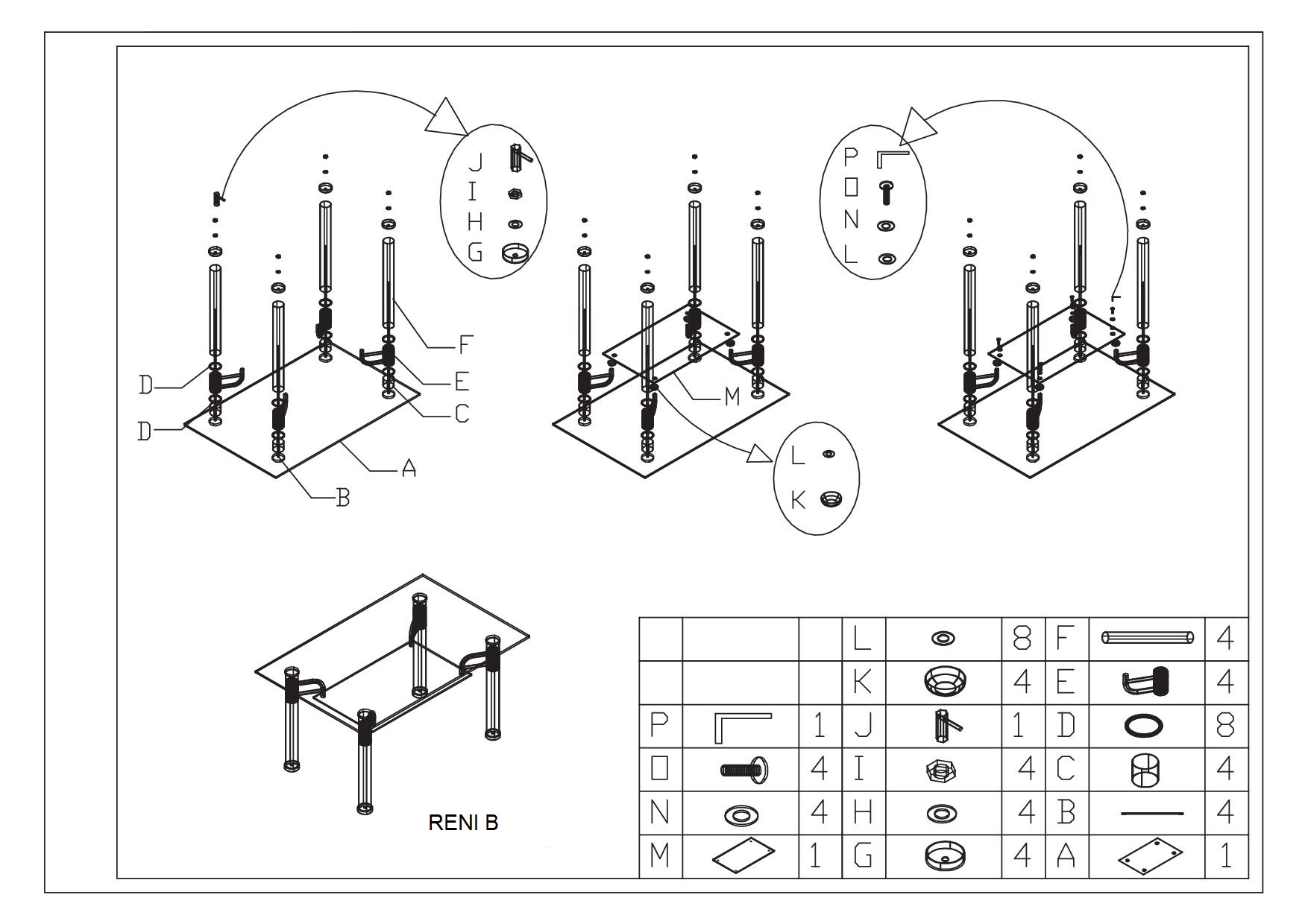 Konferenčný stolík Reni B vychádza dizajnovo aj funkčne zo stola Reni A. Zaujímavo sú riešené nohy stola, ktoré majú vrúbkovaný vzor. Stolík je vysoký 44 cm. Vrchná časť stola je z priehľadného tvrdeného skla, pod ktorou sa nachádza odkladacia plocha z bieleho mliečneho tvrdeného skla.