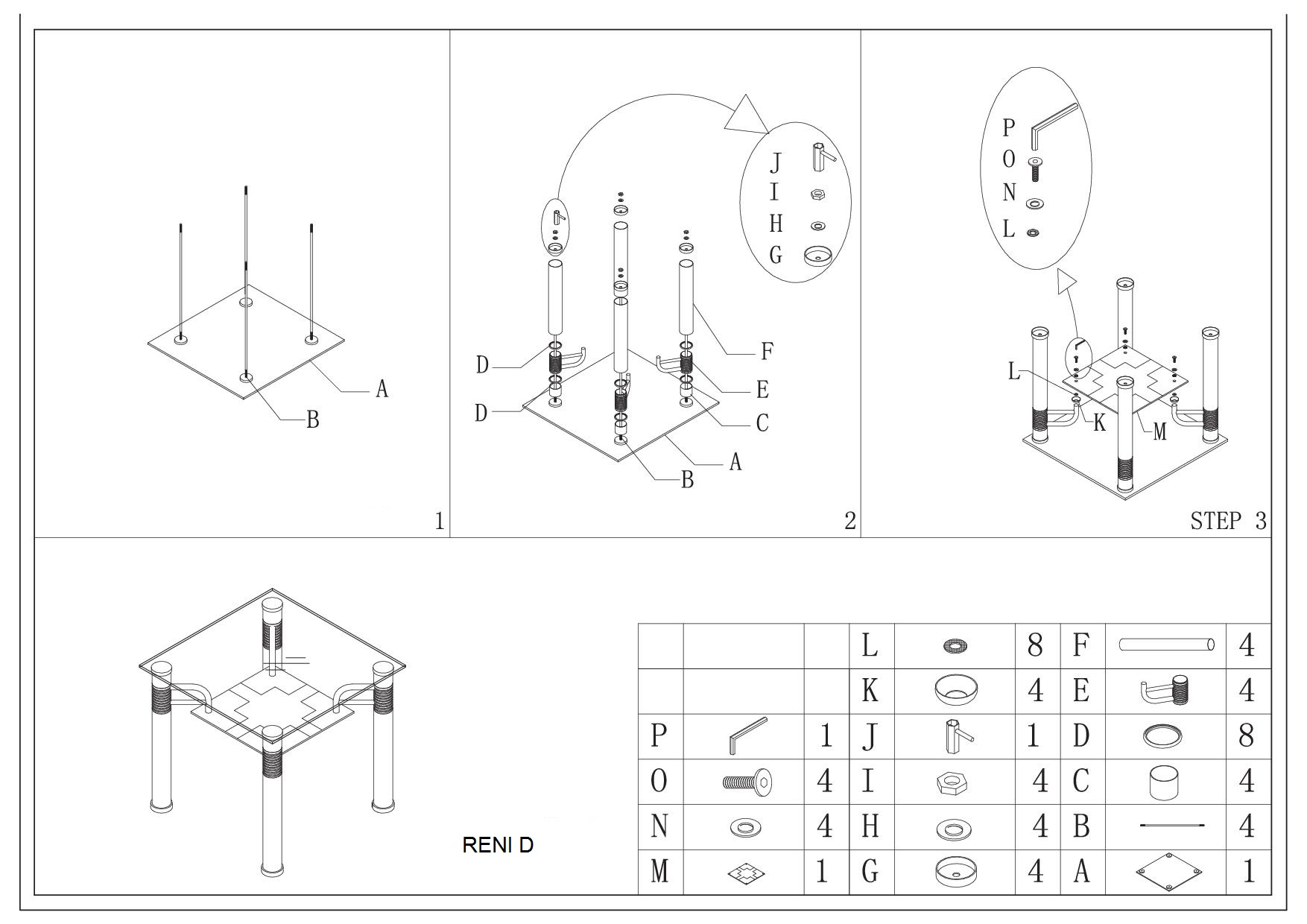 Konferenčný stolík Reni B vychádza dizajnovo aj funkčne zo stola Reni A, ale má menšie rozmery. Zaujímavo sú riešené nohy stola, ktoré majú vrúbkovaný vzor. Stolík je vysoký 55 cm. Vrchná časť stola je z priehľadného tvrdeného skla, pod ktorou sa nachádza odkladacia plocha z bieleho mliečneho tvrdeného skla.