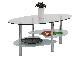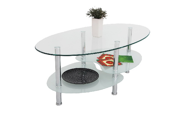 Konferenčný stolík Sany má zaujímavo navhnutú dolnú poličku, ktorá je dizajnovo rozdelená na dve úrovne. Vyrobená je z tvrdeného miečneho skla, na rozdiel od hornej dosky, ktorá je zo skla číreho. Štyri podporné nožičky sú vo farbe chrómu.