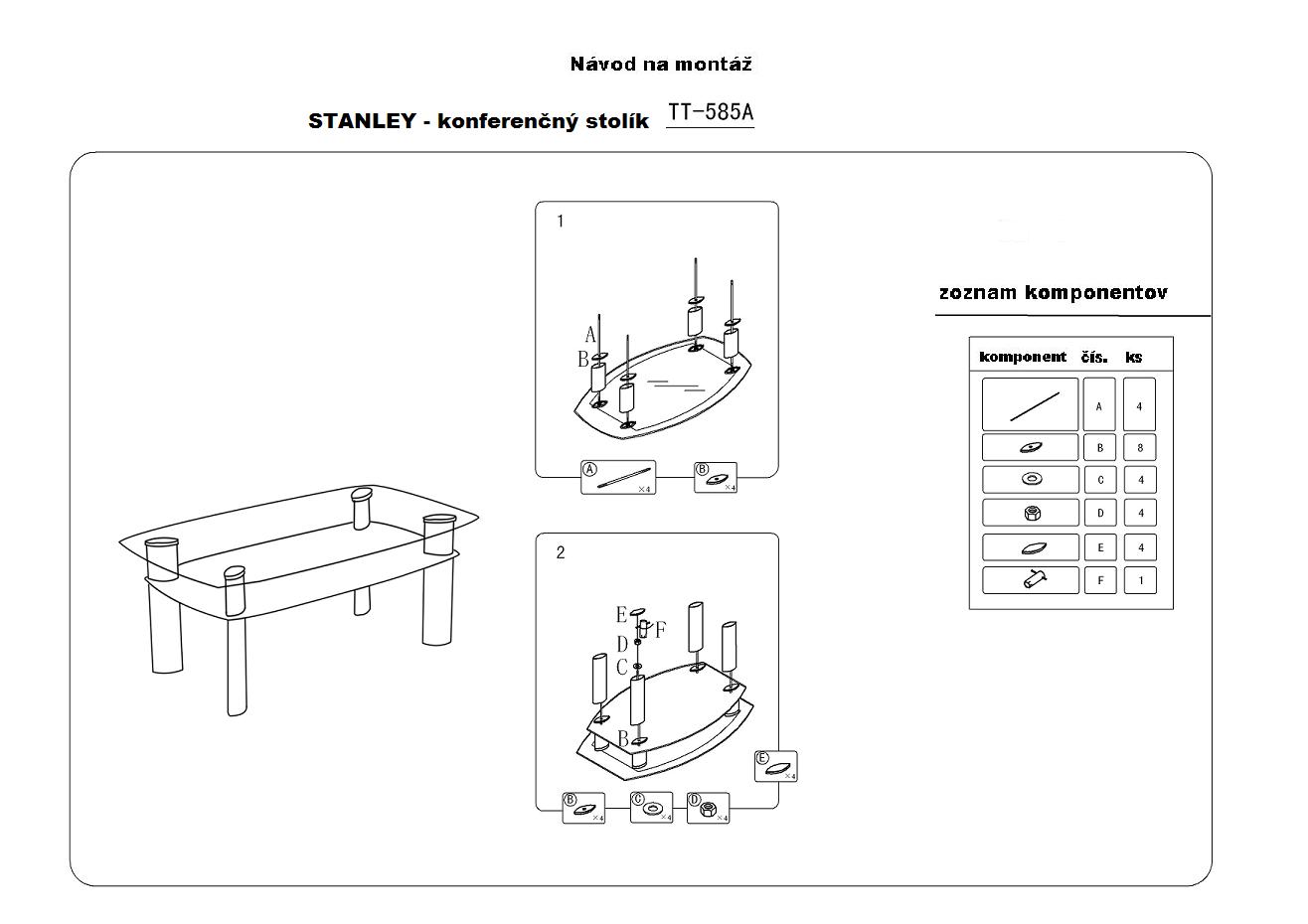 Luxusný konferenčný stolík Stanley TT-585A má masívne kovové nohy striebornej farby, ktoré držia dve úrovne odkladacích plôch. Horná je z číreho tvrdeného skla (8mm) a na okraji sa nachádza čierny pás. Dolná polička je tiež sklenená (5mm), no zafarbená na čierno. Odporúča sa kombinovať s jedálenským stolom Stanley TD-585 a TV stolíkom Stanley TV-900.