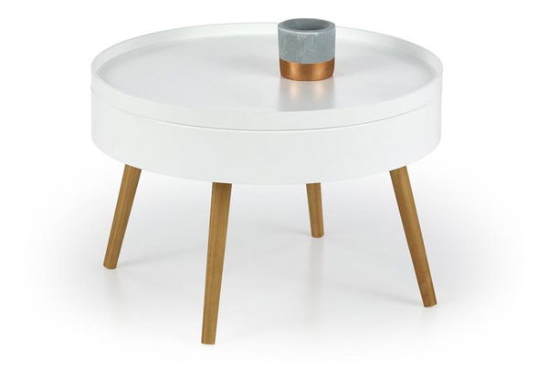 Moderný biely stolík do obývačky Starlet je inšpirovaný úspešnou škandinávskou architektúrou. Efektná horná doska je povrchovo upravená lakom s vysokou hygienickou klasifikáciou E1. Túto dosku je možné odnímať a posluži tak aj ako tácka pre uľahčený prenos nápojov alebo jedál. Zároveň sa pod ňou nachádza praktický uložný priestor. Nohy sú z masívneho dreva bez alergénov, čo bolo zabezpečené vodnou hypoalergénnou emulziou. Veľmi jednoducho sa montujte a vďaka univerzálnym farbám a minimalistickému vzhľadu sa ľahko kombinuje s rôznymi inými prvkami v miestnosti.