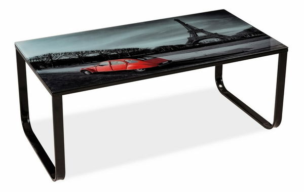 Štýlový konferenčný stolík v modernom prevedení. Kovová konštrukcia je čiernej farby, doska je z čierneho tvrdeného skla, doplnená o vzor mesta Paríž.