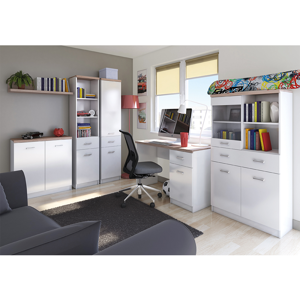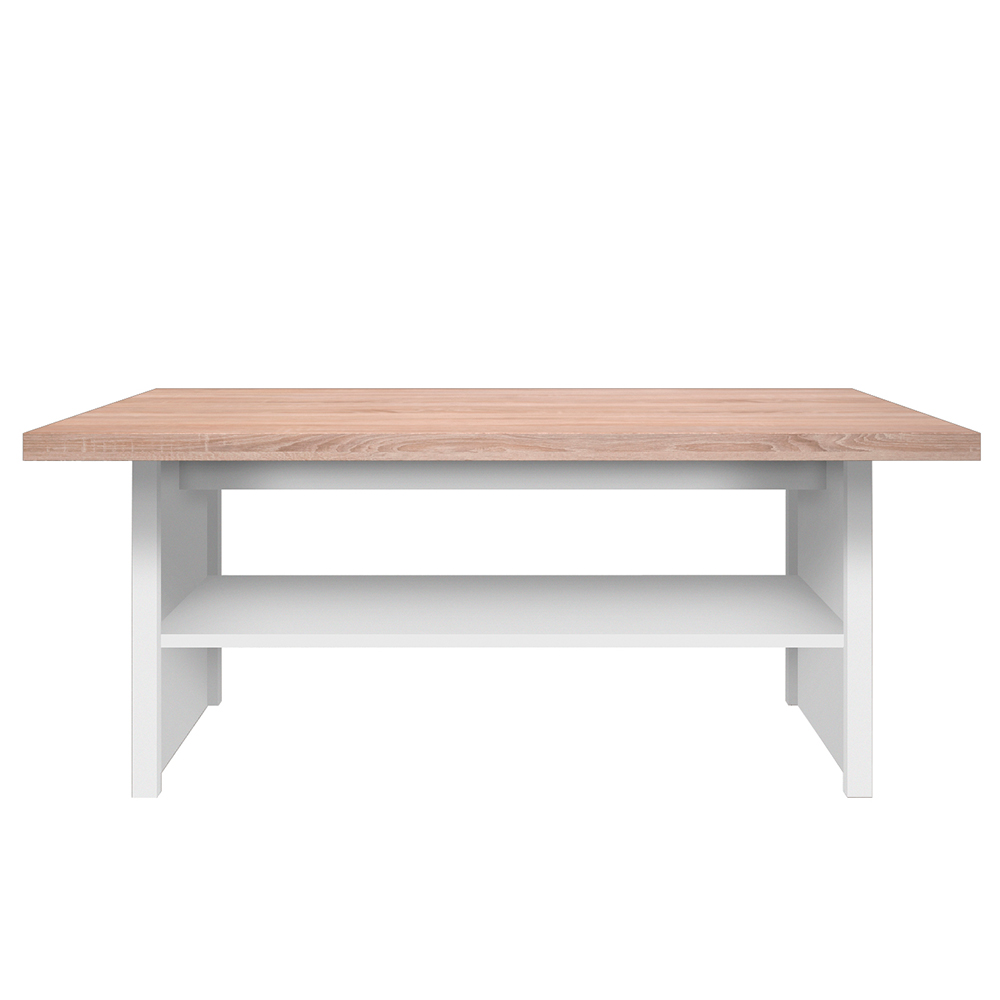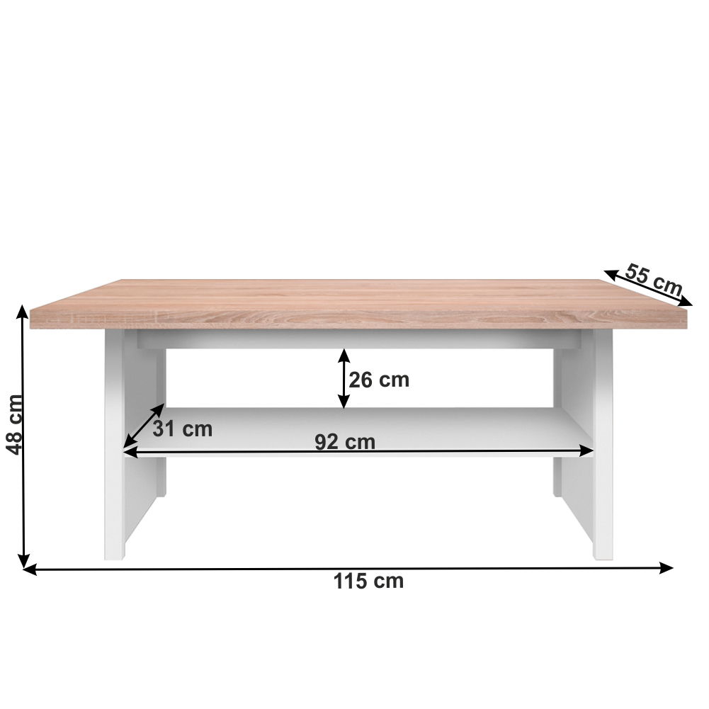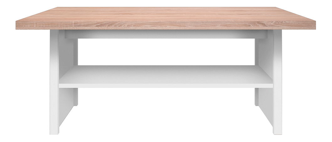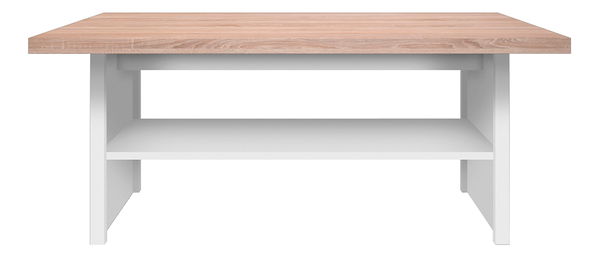 Konferenčný stolík v jednoduchých farbách, dokonale vnáša do miestnosti čistotu a sviežosť. Vrchnú dosku má v prevedení dub sonoma a ozvláštnený je chrómovými úchytkami. Má navyše policu, kam si odložite knihu, ovládače či iné drobnosti.