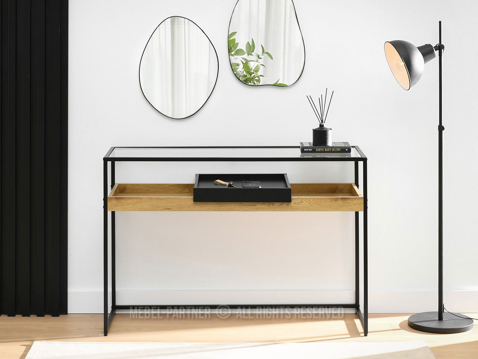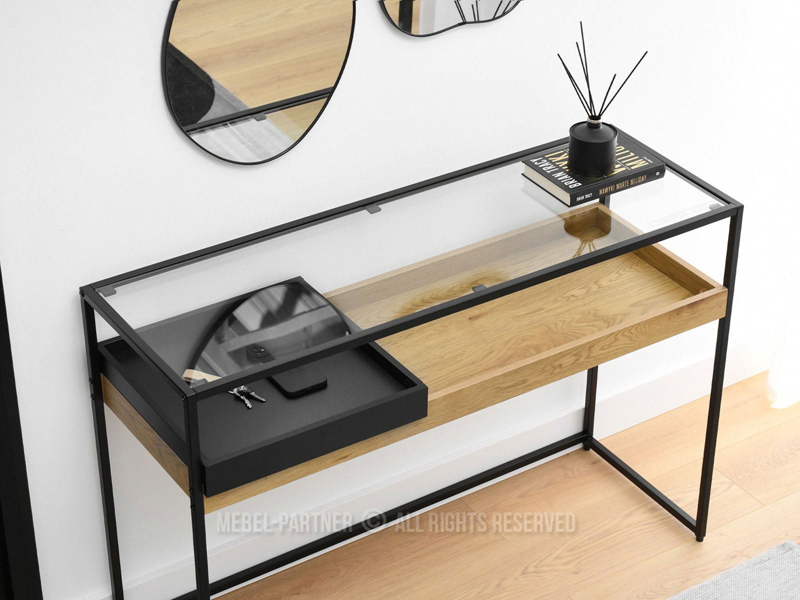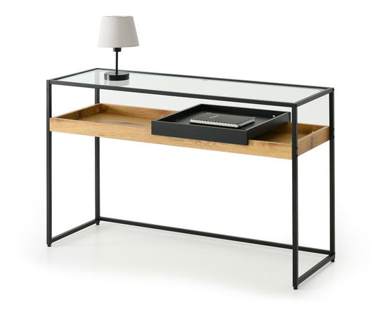 Konzolový stolík Eliash prináša do vášho interiéru moderný a praktický prvok. Jeho pevná kovová konštrukcia a sklenená doska zaručujú stabilitu a zároveň vizuálne odľahčujú priestor. Praktická odkladacia plocha doplnená o zásuvku umožňuje uložiť drobnosti, ktoré chcete mať poruke, čím tento stolík skvele doplní rôzne miestnosti vo vašom dome.