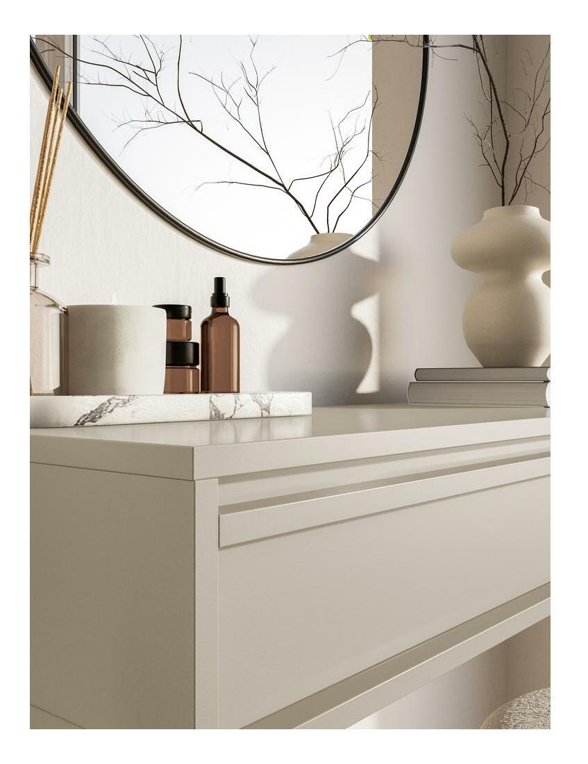 ZobraziťHľadáte alternatívu k módnym lamelám? Oceňujete minimalizmus vo svojom interiéri? Ak áno, určite sa vám bude páčiť kolekcia nábytku Konzola je spojením funkčnosti a minimalizmu. Tento malý kus nábytku dobre poslúži v predsieni, spálni aj obývačke. Vďaka svojej jednoduchej forme zapadne do väčšiny aranžmánov a stane sa ich ozdobou. Nábytok je vybavený praktickou zásuvkou, do ktorej sa zmestia drobné každodenné drobnosti, a tak udrží v izbe poriadok. Hladký vrch nepochybne využijete na vystavenie kytice kvetov, fotografií s vašimi blízkymi alebo ozdobnej krabičky s drobnosťami Detail produktu: korpus: 16 mm laminovaná doska (U750 ST9 Grey Taupe), hrany chránené 0,8 cm ABS hranou, ktorá zaručuje vystuženie proti mechanickému poškodeniu, zásuvka vybavená systémom push to open, nemá systém tichého zatvárania, farba: šedá a béžová.