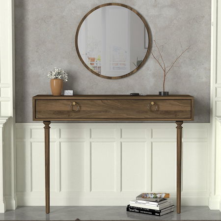 Konzolový stolík - Golden (orech), s výškou 90 cm, šírkou 120 cm a hĺbkou 35 cm, je ideálnym doplnkom pre vašu domácnosť. Tento nádherný kus nábytku kombinuje funkčnosť a štýl v jednom. Vyhotovený z kvalitného dreva orech, tento konzolový stolík prináša do vášho interiéru teplý a elegantný dotyk. S dostatočným úložným priestorom poskytuje dostatok miesta na uskladnenie oblečenia, kníh, dekorácií a ďalších vecí. Golden farba pridáva do vášho prostredia pocit luxusu a elegancie. Bez ohľadu na to, či ho umiestnite do obývacej izby, spálne alebo pracovne, tento konzolový stolík je skvelým doplnkom pre vaše štýlové a dobre usporiadané bývanie.