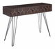 Kombinácia klasickej tmavej farby dreva, vyrezávaného vzoru na prednej časti a štíhlych nôh robí z tohto konzolového stolíka elegantný a zároveň moderný kus nábytku. Je vyrobený z odolnej drevotriesky, má tri zásuvky a širokú obdĺžnikovú dosku a je ideálny na odkladanie rôznych drobností alebo na vystavovanie fotografií, dekorácií a váz s kvetmi. Oceľové nohy zaručujú stabilitu celej konštrukcie. Celkový dizajn určite upúta pozornosť všetkých hostí.