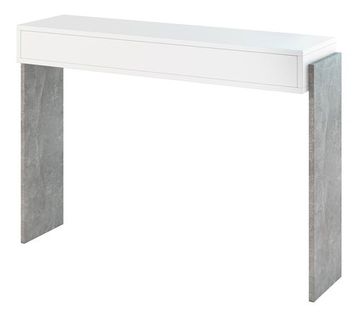 Konzolový stolík Zantra (biela + kameň) je moderný a elegantný nábytok, ktorý dodá každej miestnosti štýlový nádych. Je vyrobený z kvalitných materiálov, ktoré zaručujú jeho pevnosť a odolnosť. Stolík má výšku 80 cm, šírku 110 cm a hĺbku 35 cm, čo z neho robí ideálny kúsok nábytku pre obývačku alebo predsieň. Biela farba dodáva stolíku svieži a čistý vzhľad, kameňová doska na vrchu stolíka dodáva dojem elegancie a luxusu. Konzolový stolík Zantra je praktický a funkčný kúsok nábytku, ktorý si obľúbia všetci milovníci moderného dizajnu.