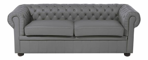 Nádherná sivá pohovka v klasickom štýle Chesterfield je výsledkom precízneho spracovania. Hrubá penová výplň zaručuje pohodlné sedenie a vďaka snímateľným poťahom sedacích vankúšov je čistenie prípadných škvŕn jednoduchšie. Pevná konštrukcia pohovky je zárukou dlhoročnej odolnosti. Vďaka nadčasovému dizajnu, prešívanému operadlu, elegantným bočným opierkam a nohám z dubového dreva sa táto pohovka stane krásnym stredobodom obývacej izby alebo kancelárie.